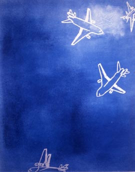 In Tara Parsons’s monotypes, airplanes fly at you from many angles: sometimes head on, or buzzing away, swooping straight into the stratosphere. Sometimes they tilt a bit, as if nodding their wings in your direction, but most often they stay a course away from the center, grazing the edge—a nimbus of white wings and tail, an empty body that punctuates otherwise deep fields of blue. At first glance this blue seems harmless, and the planes themselves oddly cheerful, like stenciled decorations adorning the room of a child: one who wakes happy and calls out for his mother—not in distress, no, but wanting only to share his glee at all the airplanes that greet him.