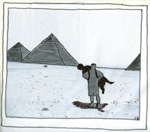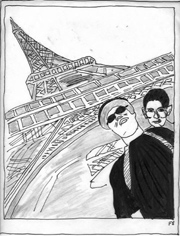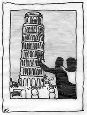 are of my father and me at ages three, seven, nine, thirteen, on and on, ages twenty, thirty, on my fortieth birthday. I will enclose tracings of us at the Eiffel Tower, the Leaning Tower of Pisa, the Pyramids of Giza. I have never been able to render facial expressions, not even on tracing paper, but if I had sent the original images, you would have noticed how my father is all smiles as he endures my weight in that waterproof, durable, poly-blend hybrid of messenger bag and hammock (attractively crisscrossed with reflective tape–a touch my mother added for safety’s sake).