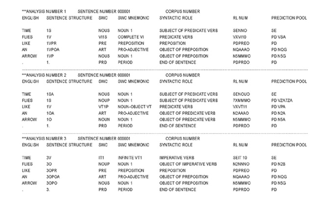 “Oh, come on.” Vandevoort had angry flecks of spittle at the corners of his lips. “You may think it’s funny, I don’t know why—but even if you really do think it’s funny, the 7090 does not. It does not say ‘ha ha’ anywhere on this printout. The computer is not laughing.” Vandevoort was seriously irritated now, his eyes darting between Dan and Julie. “And neither am I. Come on, this is just silly, this number three here, it’s just that the program is being so literal, it makes ‘time’ a verb and ‘flies’ a noun—so what? So the program thinks ‘time flies like an arrow’ is some kind of command: ‘Hey you, I want you to get a stopwatch and find some flies, I want you to time the flies, and above all I want you to time the flies in an arrowlike manner.’ You’re telling me you think that’s funny?”